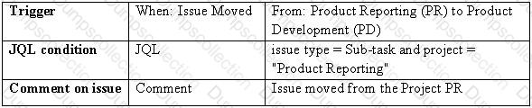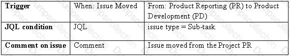 Whenever an issue is moved from the project Product Reporting (PR) to the project Product Development (PD), add a comment to all the sub-tasks of the issue stating: "Issue moved from the Project PR".