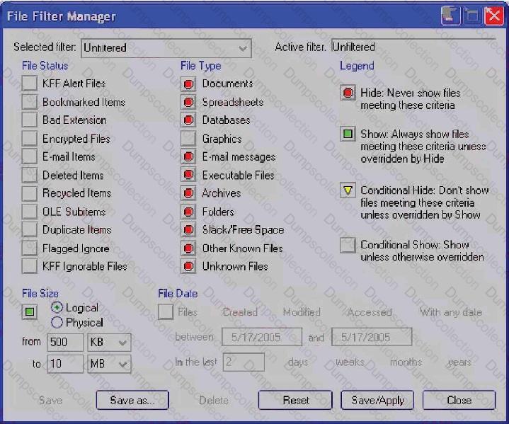 What change do you make to the file filter shown in the exhibit in order to show only graphics with a logical size between 500 kilobytes and 10 megabytes?