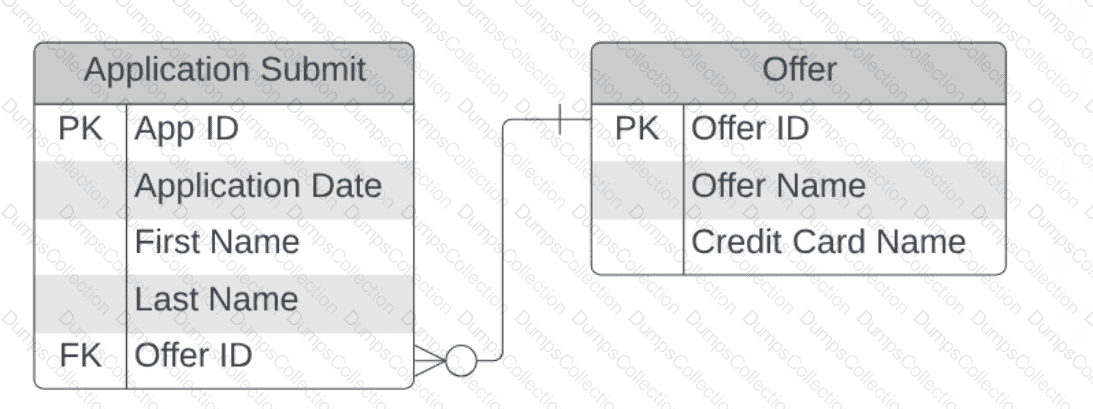 A financial services customer wishes to suppress people from active credit card campaigns as soon as they submit an application for the associated credit card name. The business's goal is to optimize ad spend by suppressing people quickly who convert and use the savings to help funnel more money back into their acquisition strategies. The current data model that IT has provided from their data warehouse looks like the following: