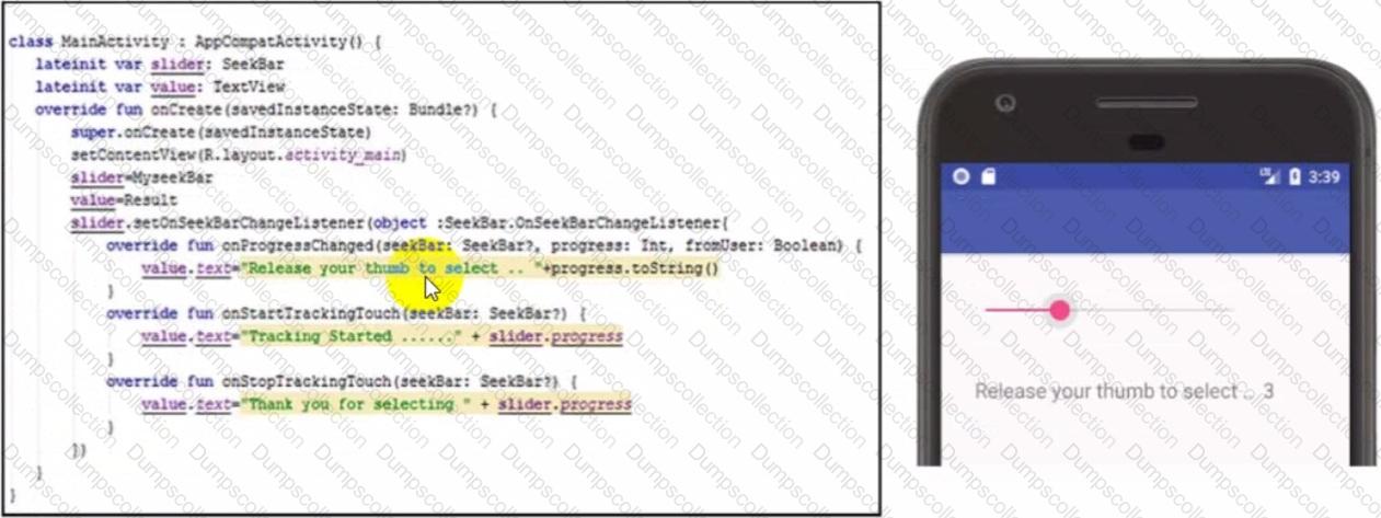The following images include an Android code for SeekBar (id: MyseekBar) and one state of its operation. What does "Result" represent in this code?