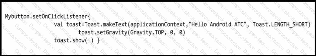Check the following image which includes Android code. In this code when the app user clicks the button, the user will get a toast message which states "Hello Android ATC". After executing the code, where on the android device screen will the toast message appear?