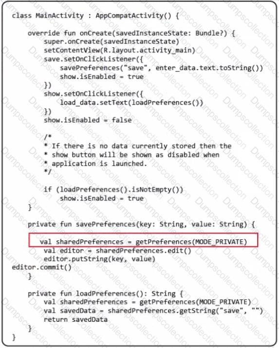 In the following image of code, what is the purpose of using MODE_PRIVATE in the method getPreferences( )?