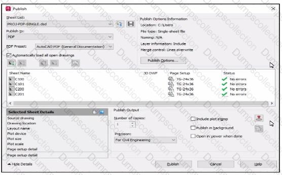 After completing markups for a portion of limit project, a CAD designer must publish new PDFs (01 sheets C200 and C201
