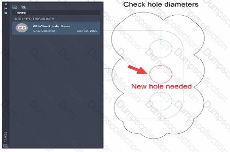 A CAD designer receives a drawing with an existing trace and update it by adding the new hole as indicated by the arrow in the exhibit.