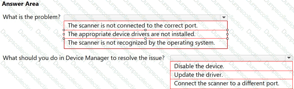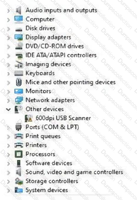 A customer cannot scan documents and pictures to a Windows laptop. When you open Device Manager, you see the 600dpi scanner listed underOther devices, as shown in the image.