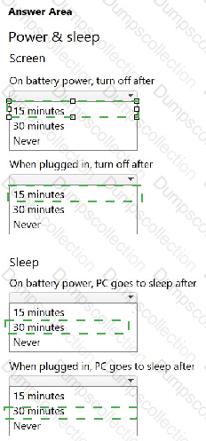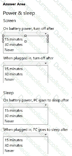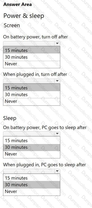 Select the correct options in the Power & Sleep settings window show in the answer area.