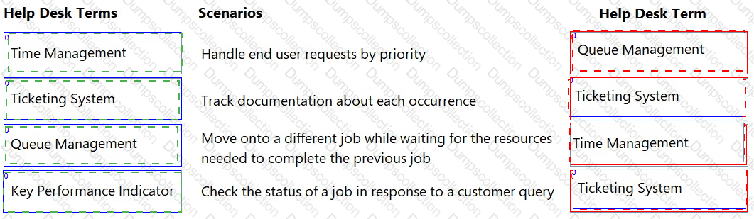 Move each help desk term from the list on the left to the scenario it describes on the right.