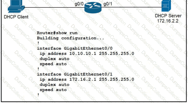 An engineer is configuring a new router on the network and applied this configuration. Which additional configuration allows the PC to obtain its IP address from a DHCP server?