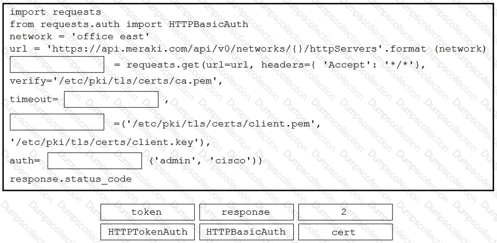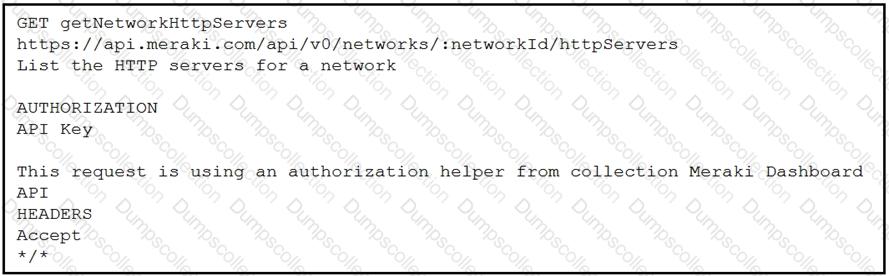 Refer to the exhibit. A developer is creating a Python script to obtain a list of HTTP servers on a network named office_east by using the Cisco Meraki API. The request has these requirements: