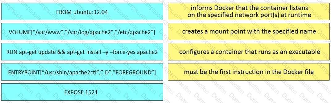 Drag and drop the Dockerfile instructions from the left onto the descriptions on the right. Not at options are used.