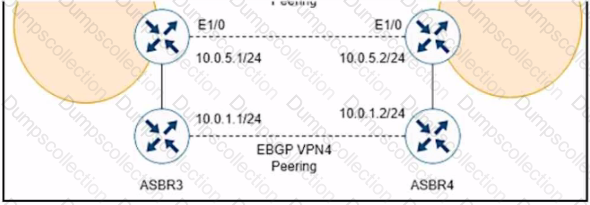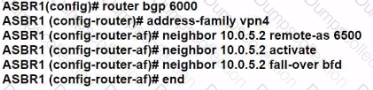 While troubleshooting, a network engineer discovers that the backup path fails between ASBR3 and ASBR4 for traffic between BGP AS6000 and BGP AS6500 when the connection between ASBR1 and ASBR2 goes down. The following configurations were performed on ASBR1:
