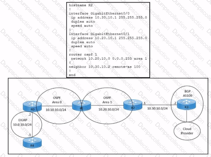 Refer to the exhibits. An engineer must redistribute OSPF internal routes into BGP to connect an on-premises network to a cloud provider without introducing extra routes. Which two commands must be configured on router R2? (Choose two.)
