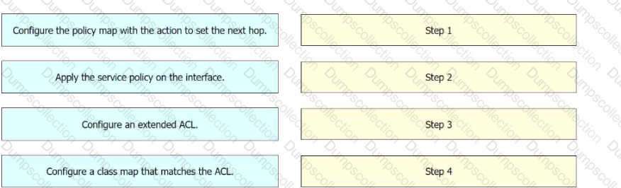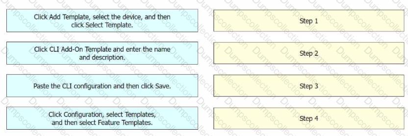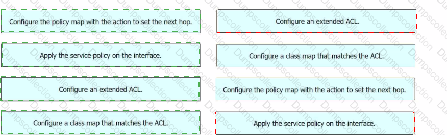 An engineer needs to configure enhanced policy-based routing (ePBR) for IPv4 by using Cisco vManage. Drag and drop the steps from the left onto the order on the right to complete the configuration of the ePBR using the CLI add-on template.