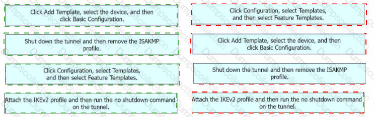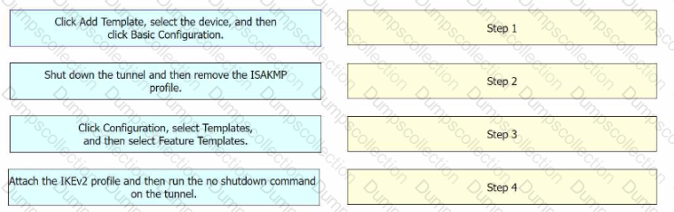 An engineer must configure a site-to-site IPsec VPN connection between an on-premises Cisco IOS XE router In Controller mode and AWS. The IKE version must be changed from IKEv1to IKEv2 in Cisco vManage. Drag and drop the steps from the left onto the order on the right to complete the configuration.