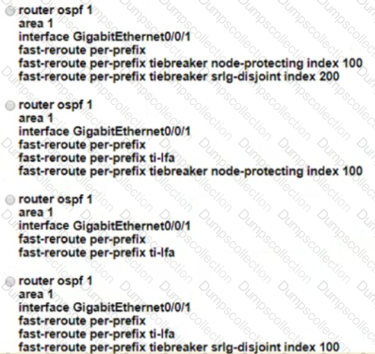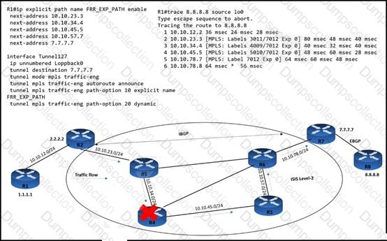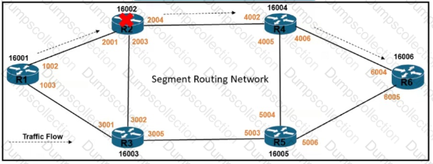 Traffic flow from router R1 to router R6 is delay-sensitive It must consider potential link-failure and node-failure conditions Which configuration must an engineer apply to router R1 to route traffic to router R6 if router R2 fails?