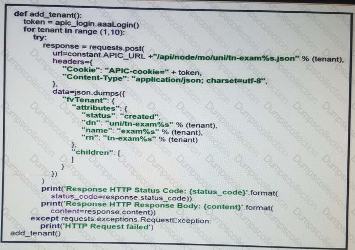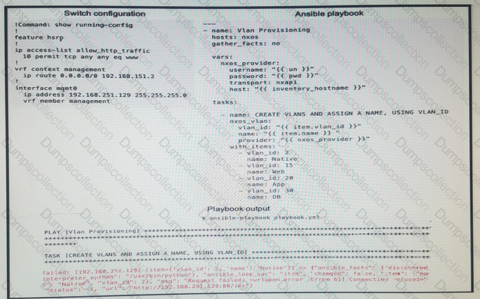 The exhibit shows a Cisco NX-OS switch configuration an Ansible playbook, and the output of running this playbook The playbook failed due to error "msg' "Request failed