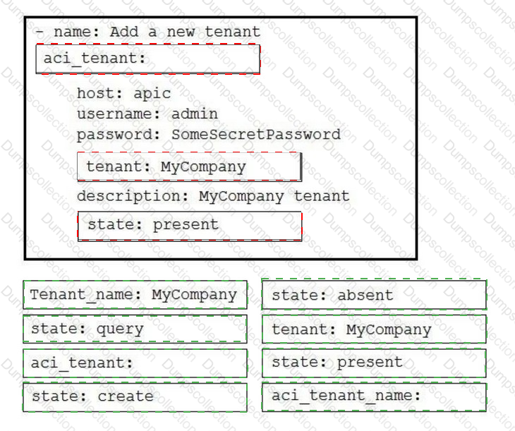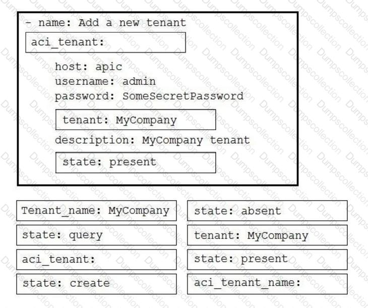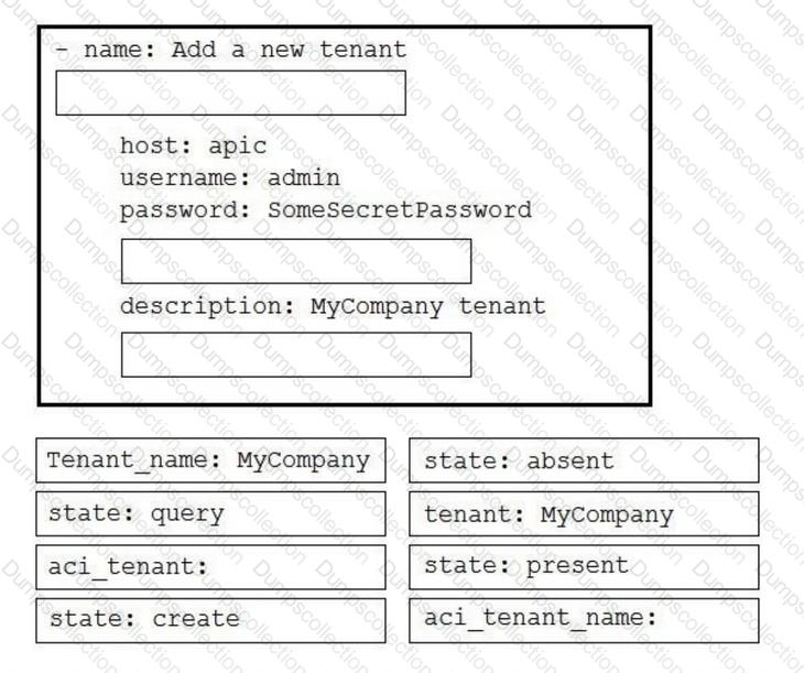 Drag and drop the code to complete an Ansible playbook that creates a new tenant. Not all options are used.