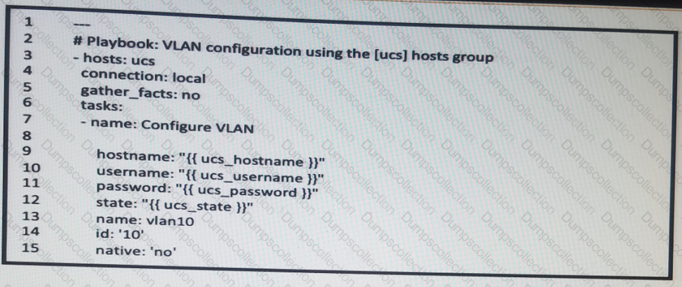 Refer to the exhibit: Which Ansible module is need in line 8 to create a new VLAN 10 on the hosts defined in the "ucs" group?
