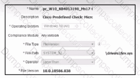 Refer to the exhibit. A security engineer must configure a posture policy in Cisco ISE to ensure that employee laptops have a critical patch for WannaCry installed before they can access the network. Which posture condition must the engineer configure?
