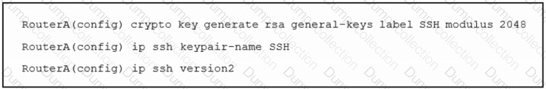 Refer to the exhibit. An engineer must enable secure SSH protocols and enters this configuration. What are two results of running this set of commands on a Cisco router? (Choose two.)
