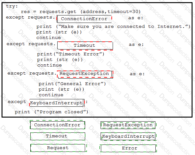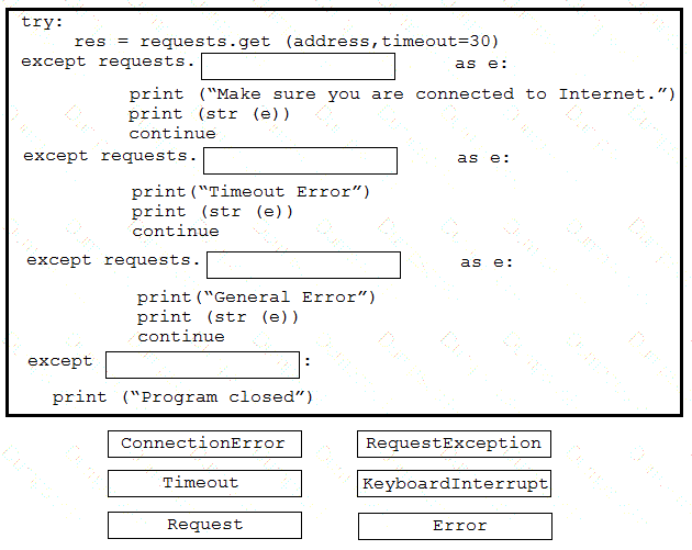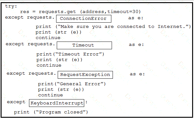 A developer is creating a Python script to catch errors using REST API calls and to aid in debugging. Drag and drop the code from the bottom onto the box where the code is missing to implement control flow for REST API errors. Not all options are used.