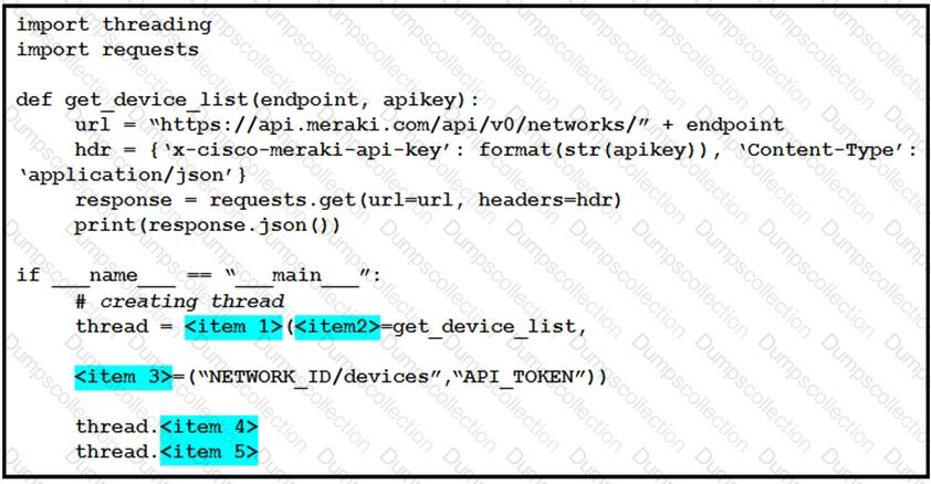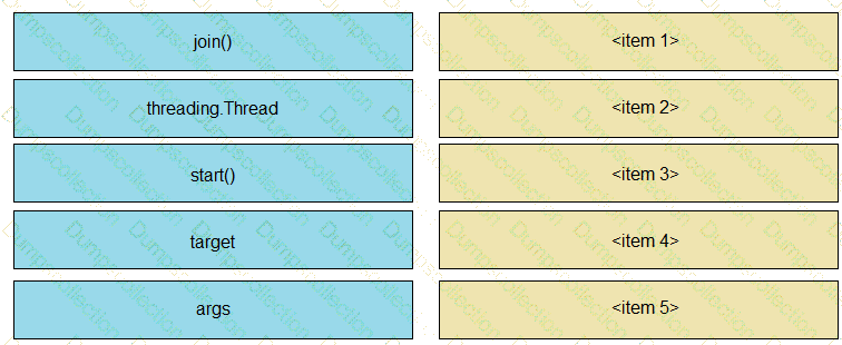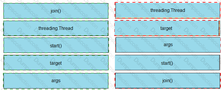 Python threading allows a developer to have different parts of a program run concurrently and simplify a design. Drag and drop the code snippets from the left onto the item numbers on the right that match the missing sections in the exhibit to create a thread instance.