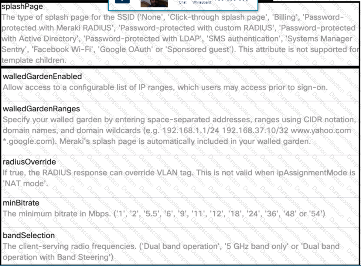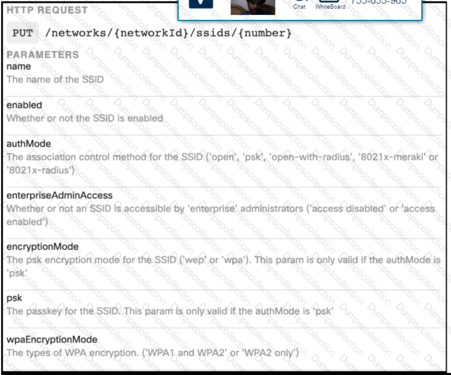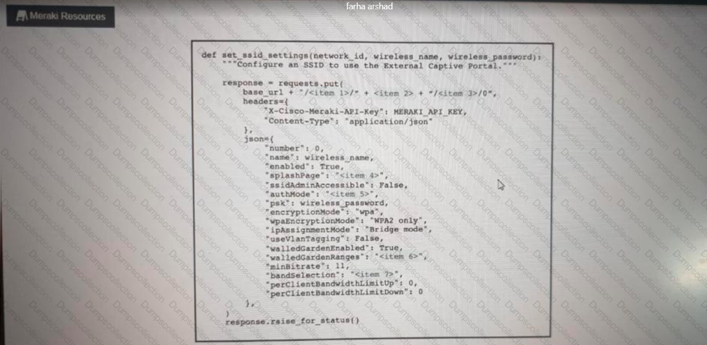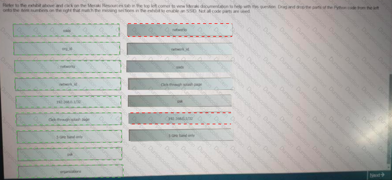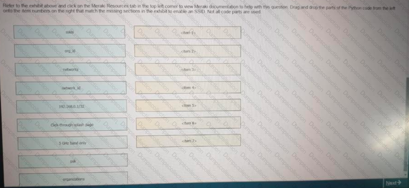Click on the Meraki Resources tab in the left corner to view Meraki documentation to help with this question.Drag and drop the parts of the python code from the left onto the item numbers on the right that match the missing sections in the exhibit to enable an SSID. Not all code parts are used.
