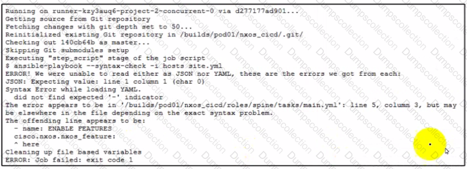 A network engineer developed an Ansible playbook and committed it to GitLab. A GitLab CI pipeline is started but immediately fails. What is the issue?