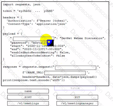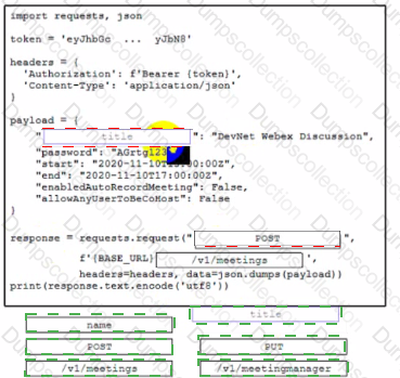 Drag and drop the code snippets from the bottom onto.the boxes where the code is missing to create a Cisco Webex meeting by using the Webex API. Not all options are used.