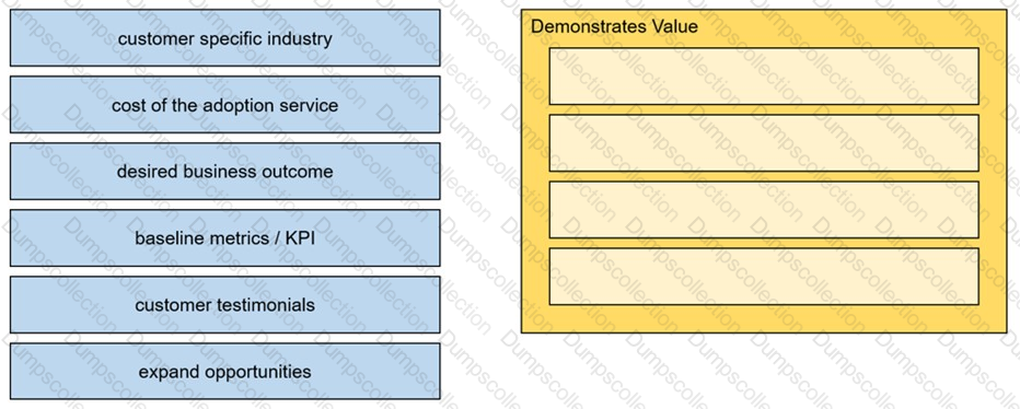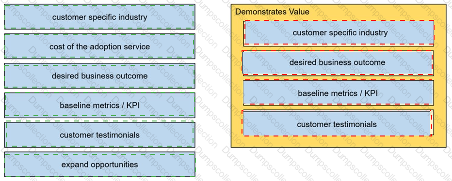 An external customer case study is being created. Drag and drop the contents which show value from the left onto the right.Not all content choices are used.