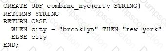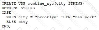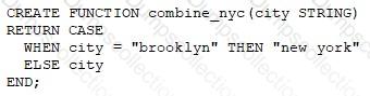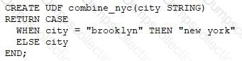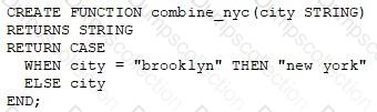 A data engineer needs to apply custom logic to string column city in table stores for a specific use case. In order to apply this custom logic at scale, the data engineer wants to create a SQL user-defined function (UDF).