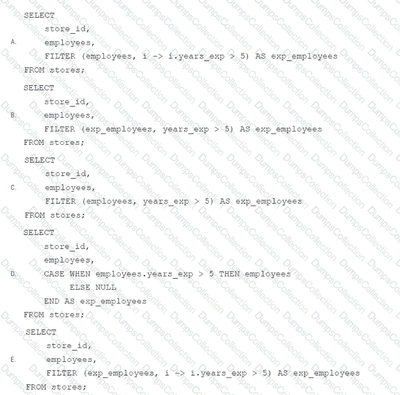 A data engineer needs to apply custom logic to identify employees with more than 5 years of experience in array column employees in table stores. The custom logic should create a new column exp_employees that is an array of all of the employees with more than 5 years of experience for each row. In order to apply this custom logic at scale, the data engineer wants to use the FILTER higher-order function.