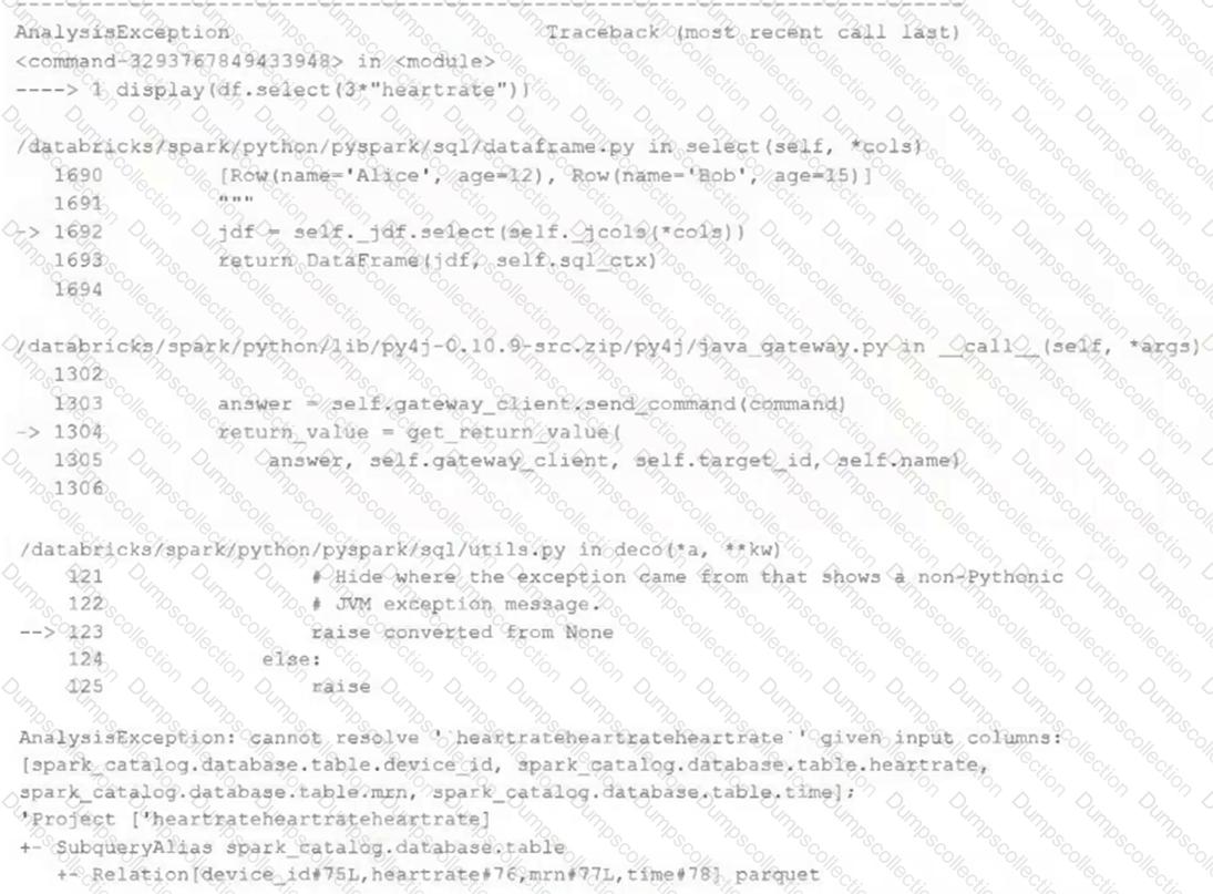 Given the following error traceback (from display(df.select(3*"heartrate"))) which shows AnalysisException: cannot resolve 'heartrateheartrateheartrate', which statement describes the error being raised?