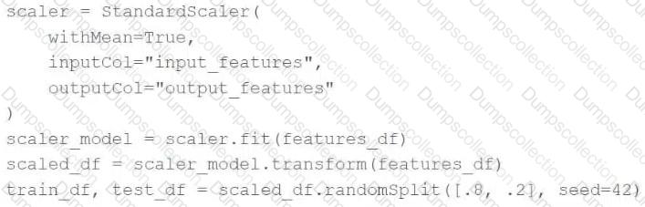 A data scientist has been given an incomplete notebook from the data engineering team. The notebook uses a Spark DataFrame spark_df on which the data scientist needs to perform further feature engineering. Unfortunately, the data scientist has not yet learned the PySpark DataFrame API.