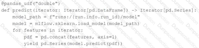 A machine learning engineer is using the following code block to scale the inference of a single-node model on a Spark DataFrame with one million records: