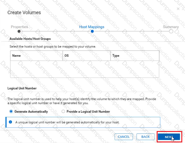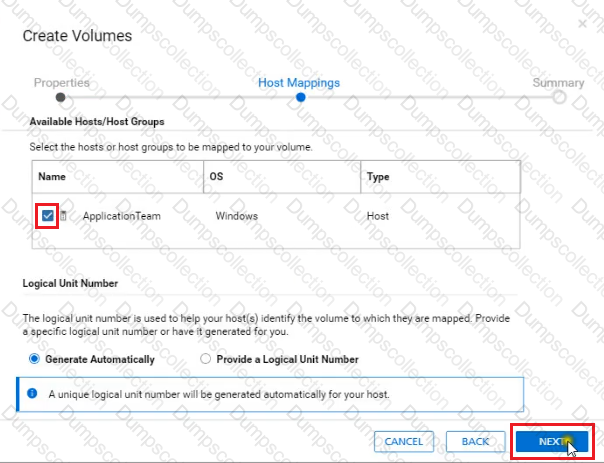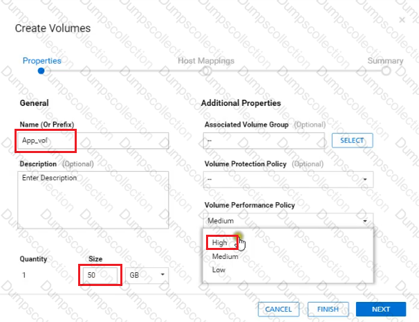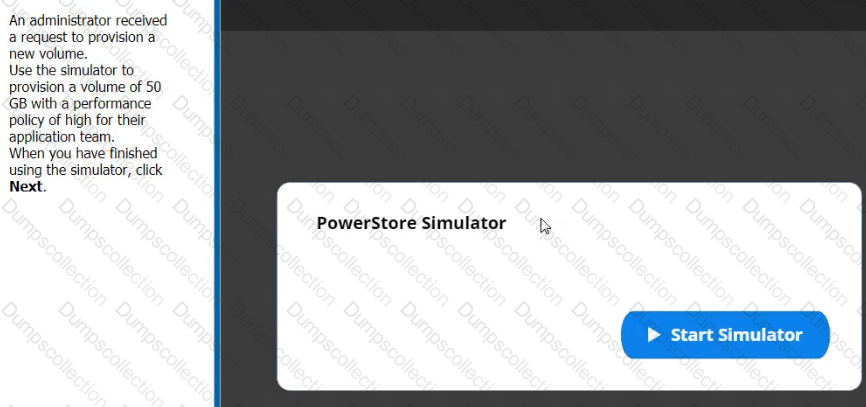 An administrator received a request to provision a new volume. Use the simulator to provision a volume of 50 GB with a performance policy of high for their host named "ApplicationTeam". When you have finished using the simulator, click Next.