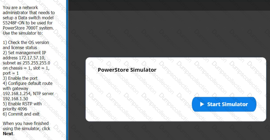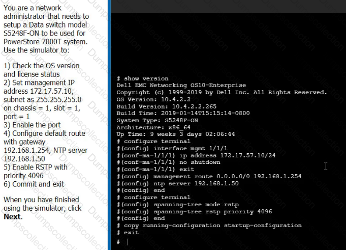 You are a network administrator that needs to setup a Data switch model S5248F-ON to be used for PowerStore 7000T system Use the Simulator to: