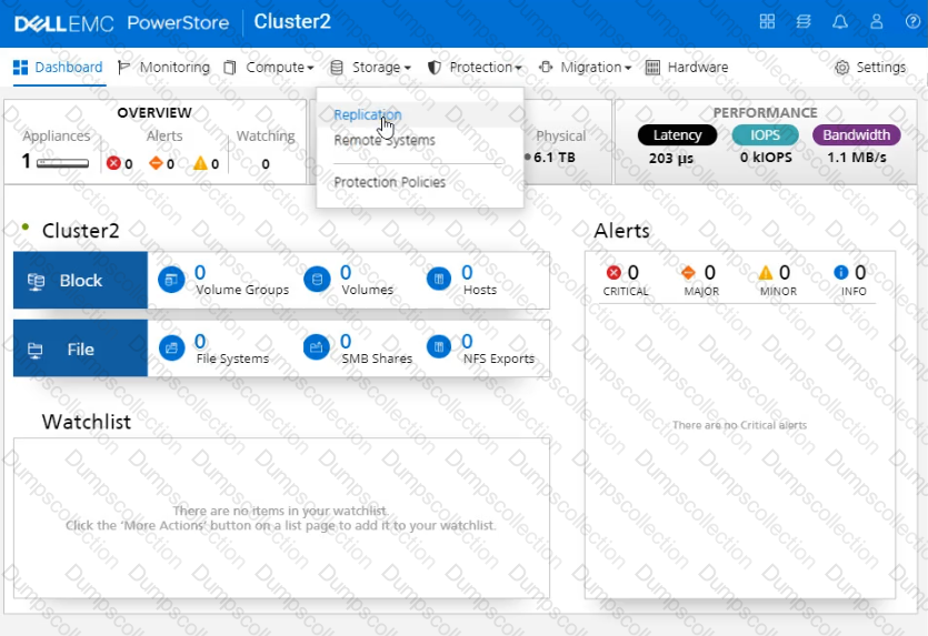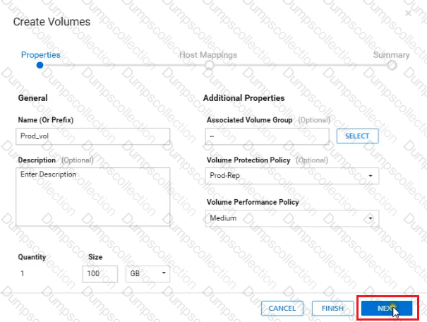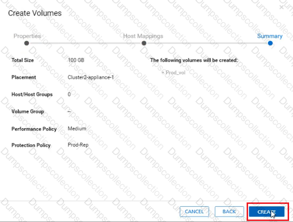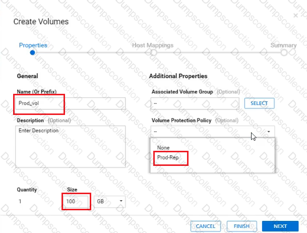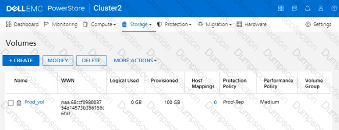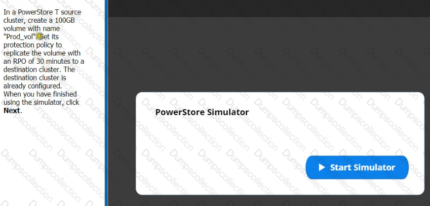 In a PowerStore T source cluster, create a 100GB volume with name "Prod_vol" and set a protection policy to replicate the volume with RPO 30 minutes to a destination cluster. The destination cluster is already configured. When you have finished using the simulator, click Next.