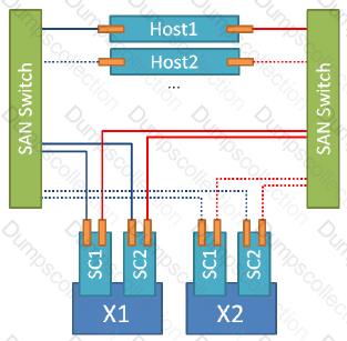 A storage administrator is configuring SAN switches and zoning to connect an eight X-Brick XtremIO array. A VMware ESXi server is hosted on a blade chassis with 16 HBA ports. In addition, the SAN is composed of two separate SAN switches.