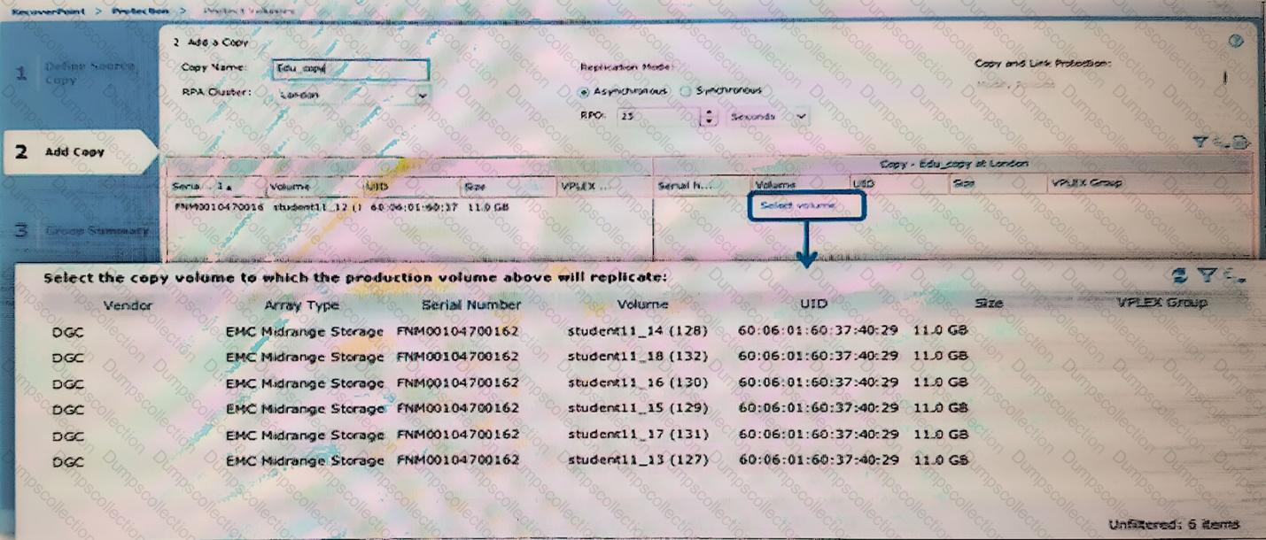 A storage administrator is creating a Consistency Group using Unisphere on RecoverPoint/EX. After defining the production volume and Journal, the next step is to select the copy volume. Based on the exhibit, what determines the volume size displayed by the wizard as a choice of copy volumes?