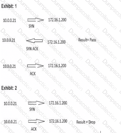 Firewall is performing stateful inspection for TCP traffic between Client 10.0.0.21 and Server 172.16.1.200.