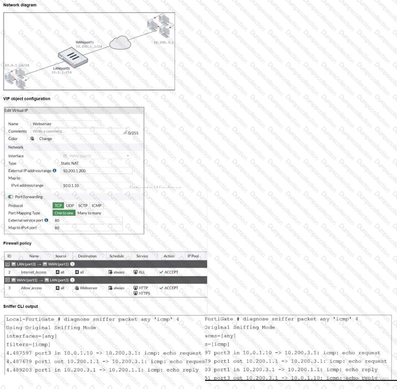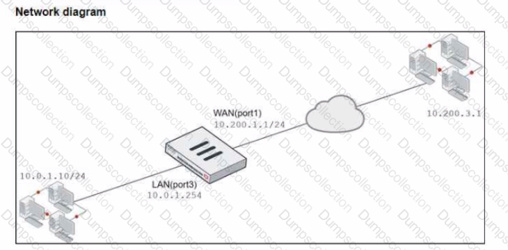 The WAN (port1) interface has the IP address 10.200. l. 1/24 The LAN (port3) interface has the IP address 10.0.1.254/24