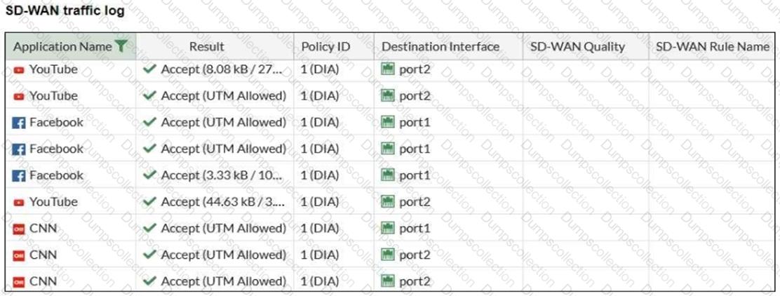 The administrator configured SD-WAN rules and set the FortiGate traffic log page to display SD-WAN-specific columns: SD-WAN Quality and SD-WAN Rule Name.