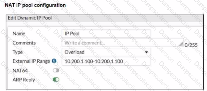 The exhibits show a diagram of a FortiGate device connected to the network, and the firewall policies configuration VIP configuration and IP pool configuration on the FortiGate device
