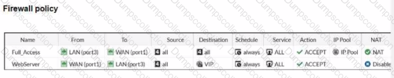 The first firewall policy has NAT enabled using the IP pool The second firewall policy is configured with a VIP as the destination address.