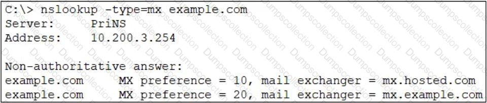 Refer to the exhibit which shows annslookupoutput of MX records of theexample.comdomain.
