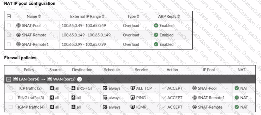 The exhibits show a diagram of a FortiGate device connected to the network, as well as the IP pool configuration and firewall policy objects.