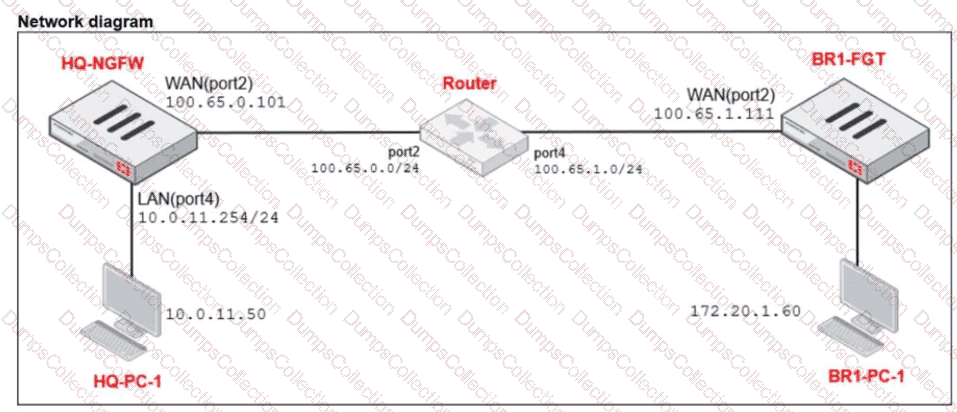 Which IP address will be used to source NAT (SNAT) the traffic, if the user on HQ-PC-1 (10.0.11.50) pings the IP address of BR-FGT (100.65.1.111)?