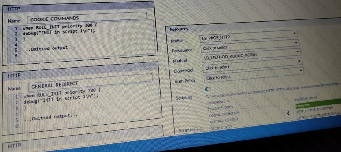 The exhibit shows the first few lines of three scripts, and a virtual server configuration leveraging these scripts.