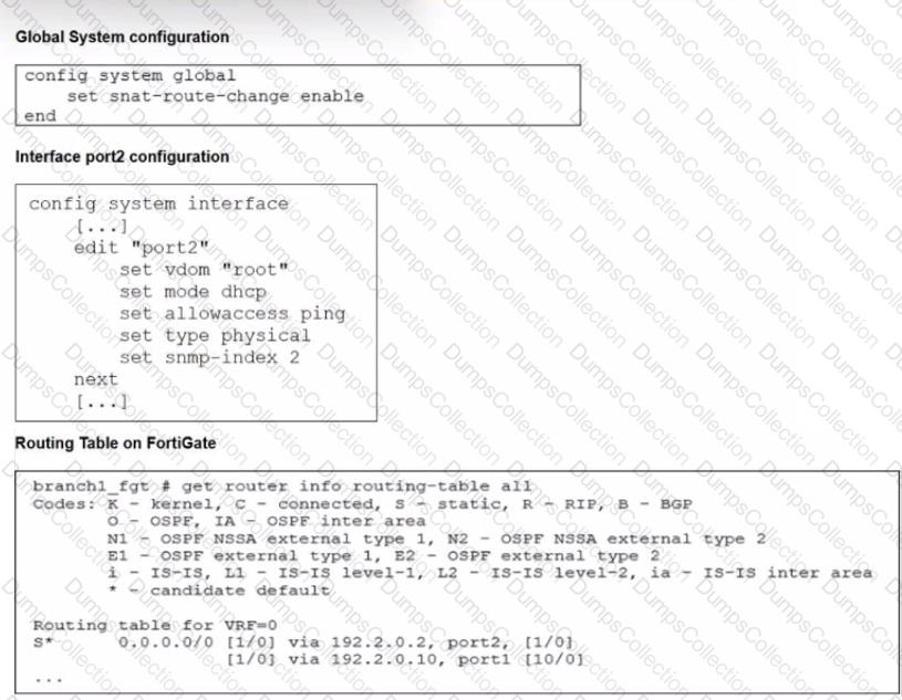 The exhibits show the source NAT (SNAT) global setting. port2 interface settings, and the routing table on FortiGate.
